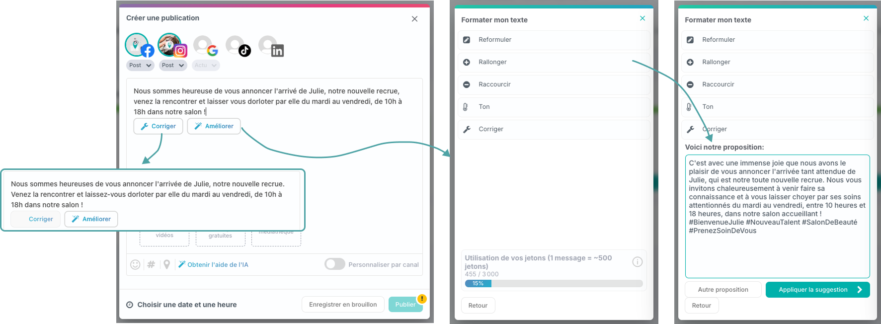- L’IA vous a généré une proposition sur mesure adaptée à votre établissement avec hashtags et emoji !